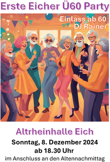 Erstmals findet im Anschluss an den Seniorennachmittag eine Ü60 Party statt, zu der wir ebenfalls herzlich einladen: