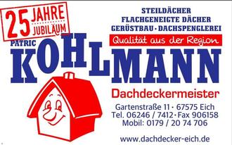 Nachdem Patric Kohlmann die Meisterschule in Mayen erfolgreich abgeschlossen hatte, gründete er am 08.06.1998 sein Geschäft. Zum Gründungszeitpunkt gab es wenige Dachdeckergeschäfte in der näheren Umgebung und er wagte den Schritt in die Selbstständigkeit – seit 25 Jahren ist der Dachdeckerbetrieb nun in Eich erfolgreich etabliert. Neben seiner Frau Nicole, die zusätzlich den Abschluss als kaufmännische Fachwirtin erworben hat und neben ihrem Hauptberuf das Büro leitet, hat der 51-jähre noch 5 weitere Mitarbeiter fest angestellt, die alle innerhalb der Verbandsgemeinde Eich wohnen.