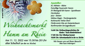 | 16.00 Uhr | Feierliche Eröffnung durch Ortsbürgermeister Eichner und dem Chor der „Freien Christengemeinde Hoffnung“ |