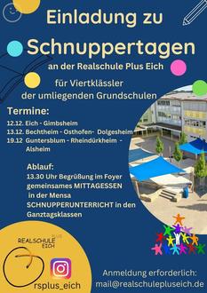 Die Schulleitung lädt alle interessierten ViertklässlerInnen herzlich zu den kommenden "Schnuppertagen" ein, um auch den Unterricht und das Essensangebot an der Realschule Plus Eich persönlich kennenzulernen. Die Anmeldung ist per E-Mail an mail@realschulepluseich.de oder unter 06246-906780 möglich.