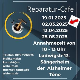 Kaputte Dinge stapeln sich bei euch im Keller? Keine Panik, auch in 2025 habt ihr die Chance, eure liebgewordenen Sachen gemeinsam mit den kompetenten Reparateuren vom Alsheimer Reparaturcafe wieder flott zu machen. Am 02.03., 13.04. und 25.05. wird das Reparaturcafe wieder von 10 bis 15:00 Uhr öffnen. Das Reparaturteam freut sich auf euch und eure Schätze. Wir möchten uns die Geräte gerne mit euch zusammen anschauen und gemeinsam Lösungen finden.
