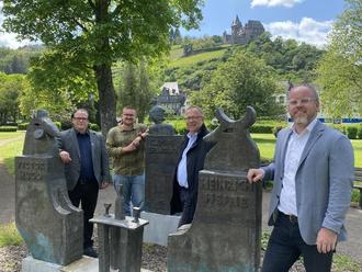 Andreas Jöckel, Philipp Rahn, Sven Stimac und Steffen Wolf (von links) an der von Liesel Metten geschaffenen Skulptur in den Bacharacher Rheinanlagen. Foto: Kreisverwaltung Mainz-Bingen/Bardo Faust