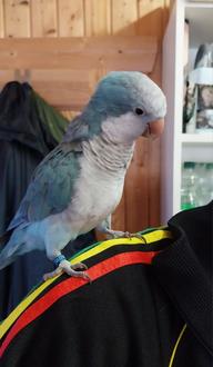 Wodka ist ein sehr menschenbezogener Mönchsittich. Er sitzt gerne auf der Schulter und gibt Küsschen. Nun sucht er Anschluss an eine passende Mönchsittich Gruppe.