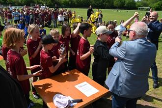 Ob es schlimm ist, dass der Austragungsort 2024 zwei Kilometer Richtung Westen wandert? „Wir freuen uns auf den Wandertag nach Waldalgesheim“, antwortete Weilers Schulchef Jannis Mack als sportlich fairer Verlierer grinsend. Das wird dann ein Spiegelbild dessen sein, was sich diesmal in Weiler abspielte: Da war die Waldalgesheimer Schule komplett zu Gast, hatte einen Wandertag hierher verlegt. Die optimalen äußeren Bedingungen für die Schüler und die jungen Fußballer sprachen für sich und machten am Ende alle Teilnehmer zu Gewinnern. Nicht nur diejenigen, denen Bürgermeister Karl Thorn in einer seiner letzten Amtshandlungen den Pokal überreichen durfte.