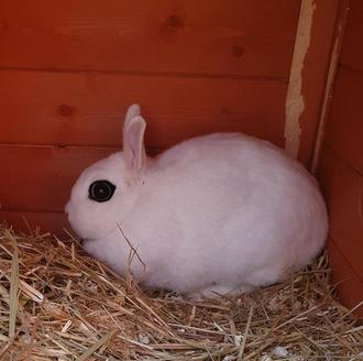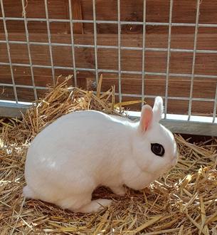 Die zwei kleinen Zwerg-Hotot Kaninchen suchen ein neues Zuhause. Aktuell sitzen sie mit zwei weiteren weißen weiblichen Zwergkaninchen im Auslauf.
