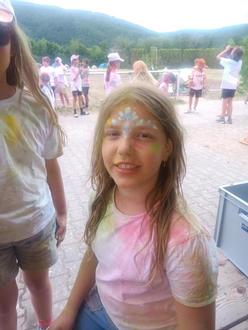 Die Kinder im Lager übernahmen kleine Aufgaben, gestalteten ihre eigenen Batik-Shirts, fertigten Schlüsselanhänger, bemalten Blumen töpfe, ließen Farbe aus Dosen über Leinwände laufen oder tobten sich auf Hüpfburg und Wasserrutsche aus. Höhepunkt war das Farbenfest, bei dem alle gemeinsam in ihren bunten T-Shirts unter Farbbeuteln tanzten. Der Besuch des Feuerwerks zu „Rhein in Flammen“ war nun um so bunter.
