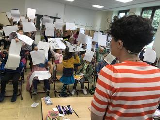 Der Einladung des Fördervereins IGEL e. V. folgend las die Autorin auszugsweise aus ihrem neuesten Buch „Otis & Otilie – Ein Pony zum Frühstück“ vor. Empathisch schenkte sie dabei allen Charakteren ihrer Erzählung - begleitet von Projektionen ihrer farbenfrohen Illustrationen - eine hinreißende Lebendigkeit. Und wie solche Figuren auf dem Papier entstehen, das präsentierte Nina Dulleck allen Kindern von der ersten bis zur vierten Schulklasse direkt mit geübter Strichführung: Dabei spielten Bohnen - im Körperbau von Tieren - und geometrische Grundformen - zur Grundlage unterschiedlichster Gesichter - eine wesentliche Rolle. Dem Aufruf das auch selbst direkt auszuprobieren folgten alle Schulkinder mit Begeisterung und Erfolg!