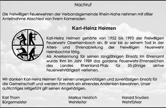 Karl-Heinz Heimen gehörte von 1952 bis 1993 der Freiwilligen Feuerwehr Oberheimbach an. Er war bis zu seinem Tod in der Alters- und Ehrenabteilung der Freiwilligen Feuerwehr Heimbachtal tätig.