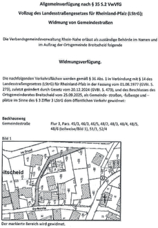 Die nachfolgenden Verkehrsflächen werden gemäß § 36 Abs. 1 in Verbindung mit § 14 des Landesstraßengesetzes (LStrG) für Rheinland-Pfalz in der Fassung vom 01.08.1977 (GVBI. S. 273), zuletzt geändert durch Gesetz vom 20.12.2024 (GVBI. S. 473), und des Beschlusses des Ortsgemeinderates Breitscheid vom 25.09.2025, als Gemeindestraßen, -wege und –plätze im Sinne des § 3 Ziffer 3 LStrG dem öffentlichen Verkehr gewidmet: