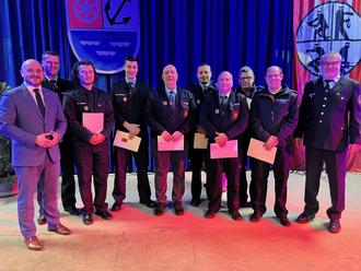 Goldenes Feuerwehr-Ehrenzeichen (35 Jahre aktive Tätigkeit): Oliver Heidrich (Diebachtal), Michael Hartmann (Heimbachtal), Markus Brendel, Stefan Steinberger (beide Waldalgesheim), Harald Snyders (Heimbachtal), Horst Rick, Dirk Dahlem (beide Trechtingshausen)