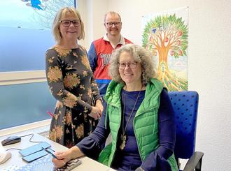 Zweite Kreisbeigeordnete Almut Schultheiß-Lehn (links) und Volker Conrad, Abteilungsleiter der Sozialen Hilfen, begrüßen Ursula Büsch in Ingelheim. (Foto: Kreisverwaltung Mainz-Bingen)