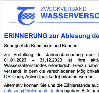 Hinweis: Haushalte, deren herkömmliche mechanischen Wasserzähler bereits gegen elektronische Ultraschall-Funkwasserzähler getauscht wurden, erhalten kein Anschreiben. Die Erfassung des Zählerstandes erfolgt zum Stichtag 31.12.2023 über Funkauslesung durch den Zweckverband.