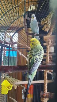 Die grüngelb gefiederte Jacky und der hellblaue Jocky suchen ein neues Zuhause. Sie sind den Freiflug in der Wohnung gewöhnt. Leider wissen wir nicht wie alt sie sind.