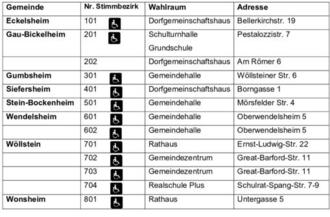 Die Gemeinden der Verbandsgemeinde Wöllstein bilden 13 Stimmbezirke.