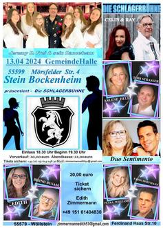 Am Samstag, den 13. April 2024, gastiert die Schlagerbühne mit Schlagersternchen aus Deutschland, Österreich und der Schweiz in der Stein-Bockenheimer Gemeindehalle.