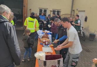 Wir haben halt etwas schneller gesammelt und pünktlich, als wir zum Abschlussimbiss auf dem Römer einliefen, kam endlich die Sonne raus, sodass das im Innenhof des DGH aufgebaute „Buffet“ mit Fleischwurst, Kuchen und Muffins gerne genutzt wurde. Dabei kam man dann endlich so ins Schwitzen, dass auch das ein oder andere Kaltgetränk über die Theke ging.