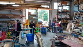 Mehrere Helfer waren dem Aufruf zum Bauen bunter Pflanzstühle aus Palettenholz gefolgt. Unter fachmännischer Anleitung von Karen Klein und Maik Zimmer wurden mit viel Muskelkraft alte Paletten auseinandergebaut, zugeschnitten, zu kleinen Stühlen zusammengebaut und in vielen bunten Farben angestrichen.