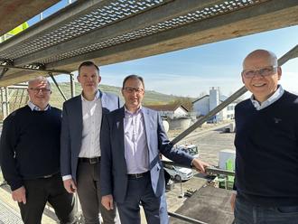 Während dem Kläranlagenbesuch nahmen die Bürgermeister gemeinsam mit den Vorständen Dennis Sartorius und Rudolf Hasselberg sowie dem Betriebsleiter der Kläranlage Matthias Balzer auch den fertiggestellten Rohbau der Faulungsanlage in Augenschein. In dem rund zehn Meter hohen Betonbau wird bis zum Jahr 2027 mit der Faulungsanlage das „Herzstück“ des Modellprojekts eingerichtet. Über die Faulgasproduktion der Klärschlämme aus Wöllstein und Gau-Bickelheim sowie der Co-Substrate der Fa. Sutter und deren Verstromung über ein Blockheizkraftwerk sollen weitere 550.000 kWh Strom pro Jahr erzeugt werden – genug um die Kläranlage Gau-Bickelheim energieneutral zu betreiben. Die Gasproduktion ist zudem ausreichend, um auch in Wöllstein eine vergleichbare Strommenge zu produzieren und somit auch diese Kläranlage vom kommunalen Großverbraucher zum Energieerzeuger umzustellen.