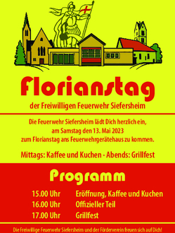 am Samstag, den 13.05.2023 wollen wir unsere Feuerwehr in Siefersheim mit dem Feuerwehrfest zum Florianstag so richtig feiern! 135 Jahre Feuerwehr und 10 Jahre Förderverein in Siefersheim sind uns dafür ein willkommener Anlass.