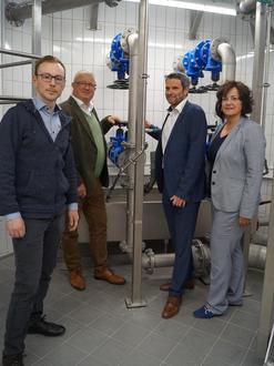Bildunterschrift von links nach rechts Werkleiter Patrick Mayer, Bürgermeister Gerd Rocker, Prokurist Philipp Held und Frau Heike Willius (Wasserversorgung Rheinhessen-Pfalz)
