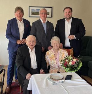 Vor wenigen Wochen konnte das Ehepaar Hildegard und Winfried Brühl aus Wöllstein das seltene Fest der Eisernen Hochzeit feiern. Dieses besondere Ereignis wurde natürlich gebührend gefeiert. Für den Landkreis Alzey-Worms überbrachte die Glückwünsche Landrat Heiko Sippel und für die Verbandsgemeinde Bürgermeister Gerd Rocker sowie für die Ortsgemeinde Ortsbürgermeister Johannes Brüchert. Das Ehepaar Brühl ist fest in der örtlichen Gemeinschaft von Wöllstein verwurzelt und hat sich in den verschiedensten Bereichen tatkräftig eingebracht und engagiert. Soweit es die Gesundheit zulässt, nehmen beide auch heute noch am Ortsgeschehen Anteil. Winfried Brühl gehörte lange Jahre dem Ortsgemeinderat Wöllstein an und engagierte sich intensiv in den Gremien der Katholischen Kirchengemeinde „St. Remigius“. Auch das Singen in den Wöllsteiner Chören haben beide jahrzehntelang gepflegt. Auch Hildegard Brühl war und ist aktiv in der Katholischen Kirchengemeinde und insbesondere im örtlichen Seniorenclub. Für ihr langjähriges Wirken für das Gemeinwohl wurde sie mit dem Verdienstorden der Verbandsgemeinde Wöllstein in Gold ausgezeichnet. Wir wünschen dem Ehepaar Brühl noch viele schöne glückliche gemeinsame Jahre in Gesundheit und Zufriedenheit.