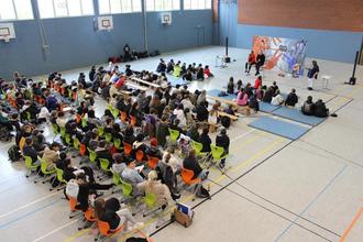 Probleme dieser Art beschäftigen die Kinder und Jugendlichen und genau das war der Stoff des Schauspiel-Duos „Radiks“ aus Berlin. Mit einer konfliktbeladenen Geschichte über den Jugendlichen Joscha, der einen Obdachlosen gerettet hat und trotzdem von seinen Freunden ausgeschlossen wird, füllten sie die Wöllsteiner Turnhalle.