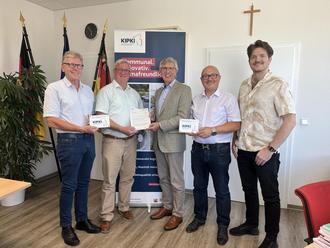 Bürgermeister Gerd Rocker, die Beigeordneten Alfons Schnabel und Oliver Heckmann sowie der Klima- und Umweltschutzmanager der Verbandsgemeinde Wöllstein, Herr Pascal Zehmer nahmen den entsprechenden Bewilligungsbescheid dankend und mit Freude entgegen.