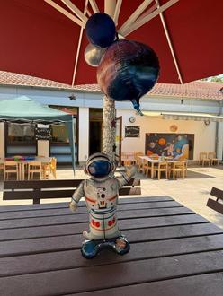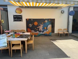 Bei strahlendem Sonnenschein und sommerlichen Temperaturen, verwandelte sich das Außengelände der Kita in eine farbenfrohe Galaxie. Sterne, Planeten und Raketen schmückten das Gelände und ließen kleine und große Besucher*innen staunen. Liebevoll gestaltete Dekorationen entführten die Gäste auf eine fantasievolle Reise ins All.