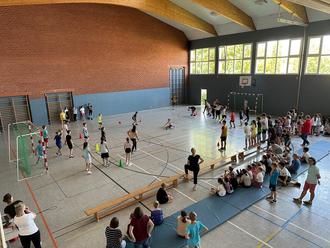 Zuvor trainierten die Schülerinnen und Schüler natürlich im Sportunterricht das Quietschie-Spiel – eine Mischung aus Handball, Völkerball und Zielwurf. Gut vorbereitet war der Ausgang am Ende sehr knapp. Vor allem die Entscheidung um Platz 2,3 und 4 entschied sich erst im letzten Spiel der 4a gegen die 5c, was lange ausgeglichen war.