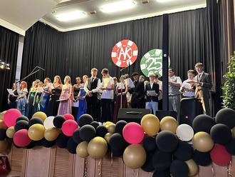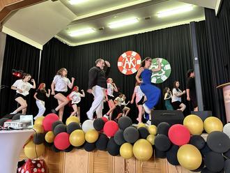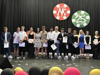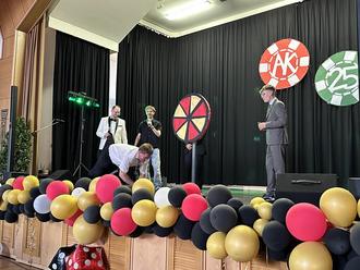 Der zweite Teil der Feier startete mit einigen Schülerprogrammpunkten. Den Auftakt bildeten zwei Diashows, die schwerpunktmäßig die gemeinsame Rom-Abschlussfahrt zum Motto hatten. Unter dem Punkt „Casino-Spiele“ mussten Lehrkräfte anhand von Schriftproben und Kinderfotos die jeweiligen Schülerinnen und Schüler erkennen. Ein einstudierter Sketch hielt die gute Stimmung auf Level.