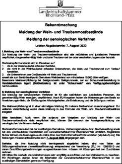 Die Meldeformulare sind bei der zuständigen Gemeinde-, Verbandsgemeinde- bzw. Stadtverwaltung sowie bei den weinbaulichen Dienststellen der Landwirtschaftskammer Rheinland-Pfalz erhältlich. Registrierte Nutzer können die Meldungen auch online über das WeinInformationsPortal erstatten (wip.lwk-rlp.de). Die Meldungen müssen spätestens bis zum 7. August 2022 eingegangen sein.
