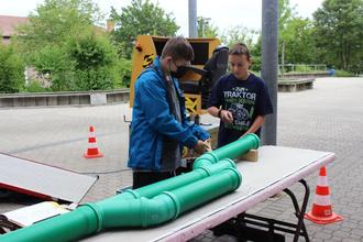 Knapp 50 Schülerinnen und Schüler der Realschule plus Rheinhessische Schweiz Wöllstein konnten an diesem Tag den Bausprinter vermessen, ein Baumemory zu verschiedenen Bauwerkzeugen und Berufen lösen, ein Hauspuzzle legen, ein Rohrlabyrinth bauen, Baugeräusche erraten und sogar ein Bagger und eine virtuelle Fahrt mit einem Radlader kamen zum Einsatz.