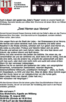 Auch in diesem Jahr gastiert das „Zettel`s Theater“ wieder an unserer Kapelle am Wißberg. Nunmehr bereits zum dritten Mal. Wie immer mit einem Stück von William Shakespeare.