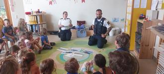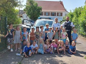 Neben den theoretischen Informationen hatten die Kinder auch die Gelegenheit, praktische Eindrücke zu sammeln. So durften sie ein echtes Polizeiauto aus nächster Nähe bestaunen und erfuhren, wofür die verschiedenen Ausrüstungsgegenstände – darunter auch Rettungswesten – verwendet werden. Die neugierigen Kinder stellten viele Fragen, die von Vanessa und Sebastian beantwortet wurden.
