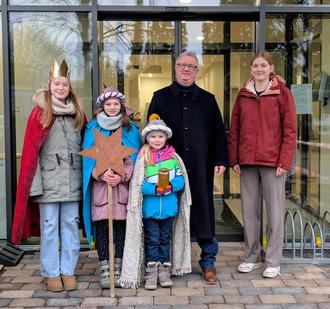 Gute Tradition ist es, dass die Sternsinger der Verwaltung und Bürgermeister Gerd Rocker einen Besuch abstatten. Mit dem traditionellen Lied „Wir kommen daher aus dem Morgenland“ überbrachten sie den Segen Gottes zum neuen Jahr und schrieben nach altem Brauch den Segensspruch 20*C+M+B+25 (deutsch: Christus segne dieses Haus) an die Tür.