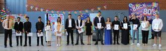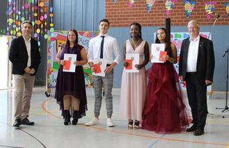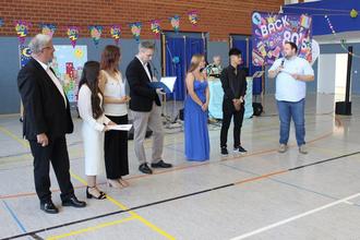 Herr Beuscher ehrte Schülerinnen und Schüler der Abschlussklassen für ihren besonderen schulischen Einsatz (Leon Schnell 9a, Valerie Falkner 10a, Josef Noetzel 10a, Angelica Colella 10b, Naile Kolgeci 10b sowie die Notenbesten (Thorwin Schneider 10a, Ewin Akyol 10b). Diese Preise wurden vom Förderverein der Wöllsteiner Schulen gestiftet. Herr Rocker und Herr Brüchert zeichneten für besonderes soziales Engagement Thorwin Schneider (10a), Tamina Ohl (10a), Larissa Mulas (10a), Josef Noetzel (10a) sowie für besonderen schulischen Einsatz Mina Hoseini (9a), Khalil Hoseini (9a), Bianca Preda (9b) und Luna Neder (9c) aus.