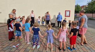 Eine Feuerwehr-Mitmachgeschichte animierte nicht nur uns, sondern auch die Jugendfeuerwehr, die dort zum Grillen verabredet war. Zusammen wurde die Mitmachgeschichte wiederholt. Das war ein Spaß für alle Beteiligten. Der nächste Hinweis zeigte die katholische Kirche.