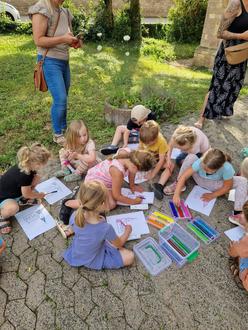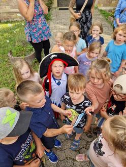 Dort malen wir ein Ausmalbild aus, bevor wir herzlich von Sandra Schmidt in der Kirche begrüßt wurden. Vielen Dank dafür. Weiter ging es Richtung Sportplatz. Dort ließen wir die Seifenblasen tanzen, bevor wir an der Schule den letzten Hinweis fanden. Dieser führte uns zurück zum Kindergarten, wo auch endlich die Schatztruhe gefunden wurden. Das kühle Eis erfreute alle. Jetzt ging es aber fix ins Bett. Als alle Zähne geschrubbt waren, schlüpften alle ins „Bett“ und lauschten der Gute- Nacht-Geschichte. Kurze Zeit später waren alle ins Reich der Träume abgetaucht.