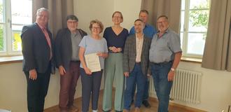 Das Foto zeigt unseren Verbandsbürgermeister Herrn Gerd Rocker, den Dorfplaner Herr Hans- Jürgen Wolf, er begleitet die Durchführung der Sanierung des Dorfgemeinschaftshauses, Ortsbürgermeisterin Frau Annerose Kinder, Staatssekretärin Frau Simone Schneider, die Beigeordneten Karl- Hans Faust und Günther Ebling, sowie Ratsmitglied Gerhard Hoffmann bei der Übergabe des Förderbescheides.