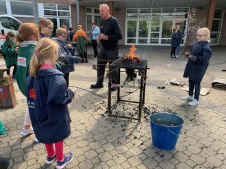 Währenddessen haben die beiden anderen Gruppen einen Platz in der Turnhalle gefunden dort bauten Sie als Team einen gemeinsamen Parkour auf, der den Kindern das Gefühl gab fliegen zu können, wenn sie mit den Trampolinen über Hindernisse sprangen oder das Gefühl zu schweben, wenn sie sich von Kasten zu Kasten schwingen konnten mit den Kletterseilen. Kraft und Teamwork war an diesem Tag gefragt. Nach dem Mittagessen tauschten die Gruppe untereinander. Eine zusätzliche Station war der beliebte Zauberschmied der mit den Kindern eigene Zauberstäbe herstellte. Ob im Stern-, Herz- oder sonstigen Formen. Der Fantasie waren keine Grenzen gesetzt.