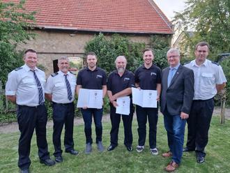 Johannes Rößler und Luca Feldhaus wurden offiziell in die aktive Mannschaft der Wehr aufgenommen und als Feuerwehrmannanwärter verpflichtet; Christoph Rößler wurde zum Oberfeuerwehrmann, Florian Feldhaus und Leon Graf wurden zum Löschmeister befördert.