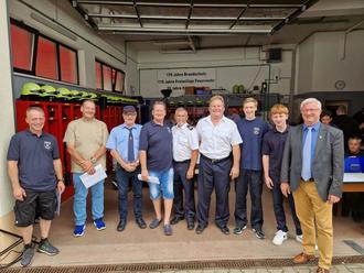 Uwe Dexheimer, Gunter Dexheimer, Thomas Roth und Heinz Jürgen Schmahl. Dem gegenüber standen die Neuverpflichtungen als Feuerwehrmannanwärter von Ben Fischborn und Dean Geib. Wehrführer Schröder bedankte sich bei den ausgeschiedenen Kameraden für das umfassende Engagement und die langjährige Zugehörigkeit als aktives Mitglied der Wehr. Bürgermeister Rocker überbrachte die Grüße und besten Wünsche der Verbandsgemeinde. Die Verbandsgemeinde als Aufgabenträger wird auch künftig die einzelnen Wehren bedarfsgerecht und zukunftsorientiert nachhaltig ausstatten und auch dafür Sorge tragen, dass den Kameradinnen und Kameraden die zwingend notwendige persönliche Schutzausrüstung zur Verfügung steht und die notwendigen Aus- und Fortbildungen angeboten werden. Bürgermeister Rocker zeigte noch einmal die neueste Fahrzeugbeschaffung, nämlich das TLF Tanklöschfahrzeug 4000 auf. Die Beschaffungskosten lagen bei 312.000 Euro. Die weiteren Fahrzeugersatz- bzw. Neubeschaffungen erfolgen im Rahmen des, durch den Verbandsgemeinderat beschlossenen, Fahrzeugkonzeptes. Sein besonderer Dank galt auch den vier ausgeschiedenen Kameraden für ihr herausragendes ehrenamtliches Engagement in der Feuerwehr. Die beiden neuen Kameraden hieß er herzlich willkommen und dankte ihnen für ihre Bereitschaft sich in der örtlichen Wehr aktiv zu engagieren. Wehrleiter Ernst Schön schloss sich den Dankesworten an. Alle Gäste verlebten noch einen schönen Nachmittag bei der Freiwilligen Feuerwehr und genossen das gute Angebot und ein geselliges Beisammensein. Für die Aktiven der Freiwilligen Feuerwehr Wöllstein endete jedoch der gemütliche Teil des Nachmittages mit einer Alarmierung; zu einem Fahrzeugbrand im Gewerbegebiet „In der Rohrgewann“ in Wöllstein. Dank des schnellen Einsatzes Vorort, konnte das Fahrzeug in kurzer Zeit gelöscht werden. Es entstand Totalschaden. Die Brandursache ist ungeklärt.
