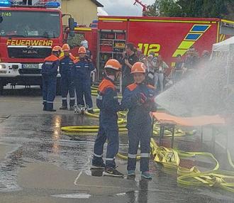Nachdem auch Ortsbürgermeister Johannes Brüchert einige Worte des Lobes und Dankes an die Feuerwehrkameraden gerichtet hatte, stand gegen 15 Uhr eine von Jugendwart Nolen Fischer moderierte Schauübung der Jugendfeuerwehr auf dem Programm. Routiniert wurde hier ein Löschangriff mit 3 Rohren auf brennende Container vorgenommen.