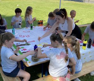 wissentlich, dass sie eine abwechslungsreiche Zeit mit viel Spiel und Spaß erwartet. Auch bei den Betreuerinnen sind „Wiederholungstäter“. Das Werkeln in der Küche ist mittlerweile ein Muss. In Eigenregie wird alles für Träumfänger zu basteln besorgt. Gerne wird am ersten Tag ein großes Banner gestaltet und aufgehängt. Anspruchsvollere Bewegungsspiele müssen sein, dieses Jahr in Form einer Olympiade auf dem Bouleplatz; die an die Kinder verteilten Urkunden krönte das Ganze.