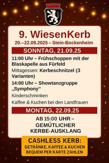Vom 20. bis 22.09.2025 lädt Stein-Bockenheim zur 9. WiesenKerb ein – drei Tage voller Programm, Musik und guter Laune!