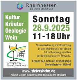 Am Sonntag, 28. September, laden die Siefersheimer Winzer und die Siefersheimer Kräuterhexen zur Wanderung auf der 8 km langen „Bänkelches-Route“ ein. Von 11 bis 18 Uhr gibt es entlang der Strecke und im Dorfzentrum Siefersheimer Weine, Aperitifs und kulinarische Spezialitäten.