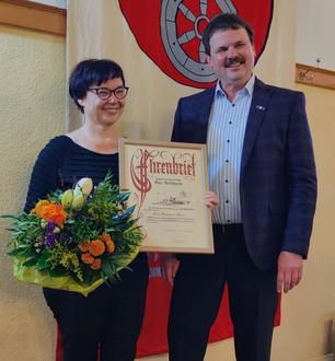 Höhepunkt im vollbesetzten Bürgerhaus war die Verleihung des Ehrenbriefs der Gemeinde. Ortsbürgermeister Vollmer verlieh diese Auszeichnung in Würdigung ihrer Verdienste um Gau-Bickelheim an Stephanie Bunn und Adi Abel.