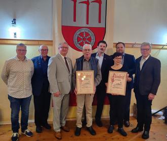 Höhepunkt beim Neujahrsempfang im vollbesetzten Bürgerhaus war die Verleihung des Ehrenbriefs der Gemeinde. Ortsbürgermeister Vollmer verlieh diese Auszeichnung in Würdigung ihrer Verdienste um Gau-Bickelheim an Stephanie Bunn und Adi Abel.