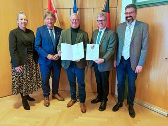 Bürgermeister Gerd Rocker konnte Anfang Januar sein 40-jähriges Dienstjubiläum feiern. Aus diesem Anlass überreichte ihm Landrat Heiko Sippel die vom Ministerpräsidenten des Landes Rheinland-Pfalz, Alexander Schweitzer, unterzeichnete Dankesurkunde. Für die Verbandsgemeinde Wöllstein gratulierte der 1. Beigeordnete Alfons Schnabel und überreichte ebenfalls eine Dankesurkunde. Den Grüßen und Glückwünschen schloss sich die Vorsitzende des Personalrates, Frau Olivia Matheis-Grieder, an.