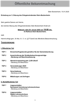 Die nächste Sitzung des Ortsgemeinderates Stein-Bockenheim findet am